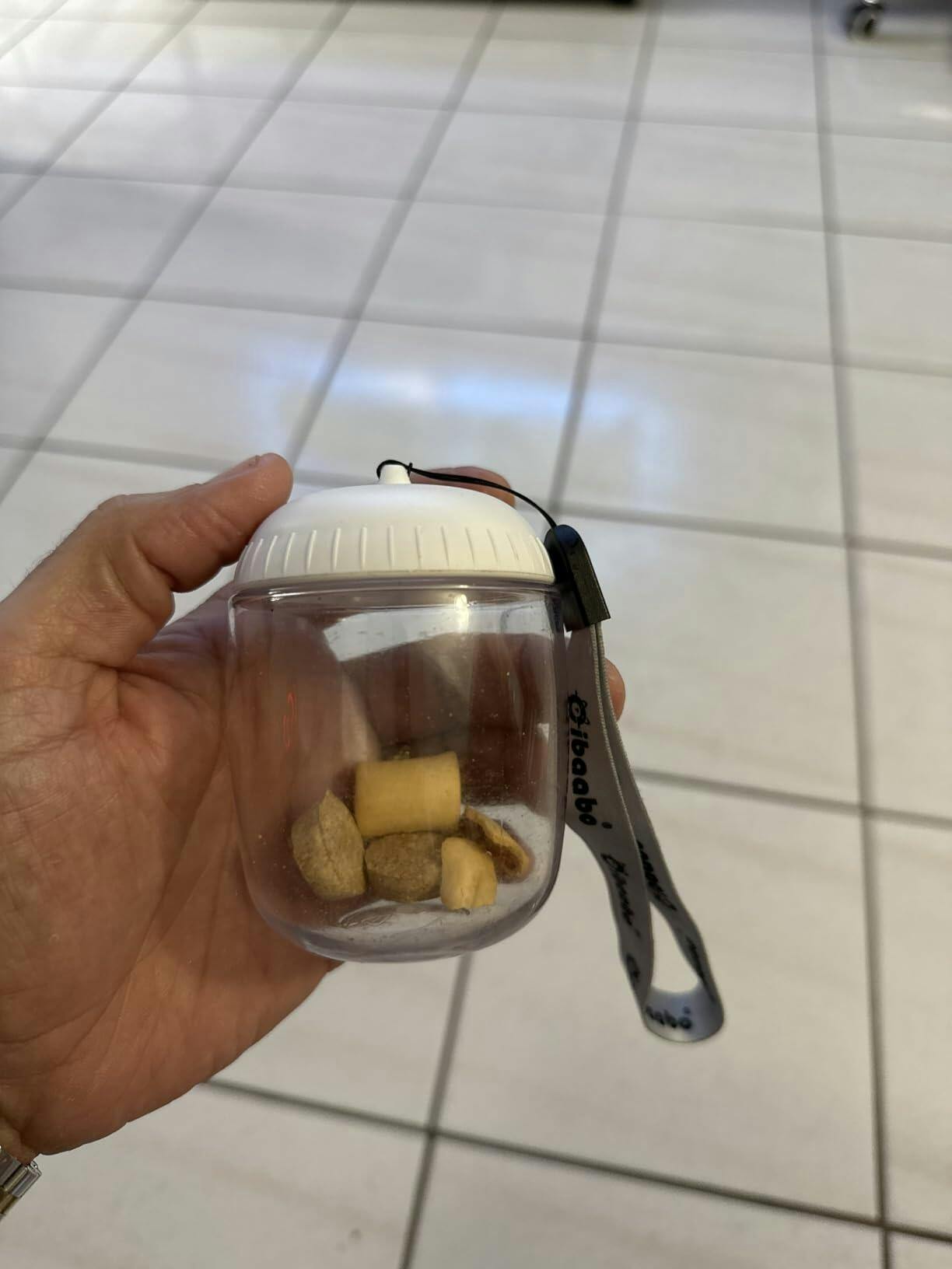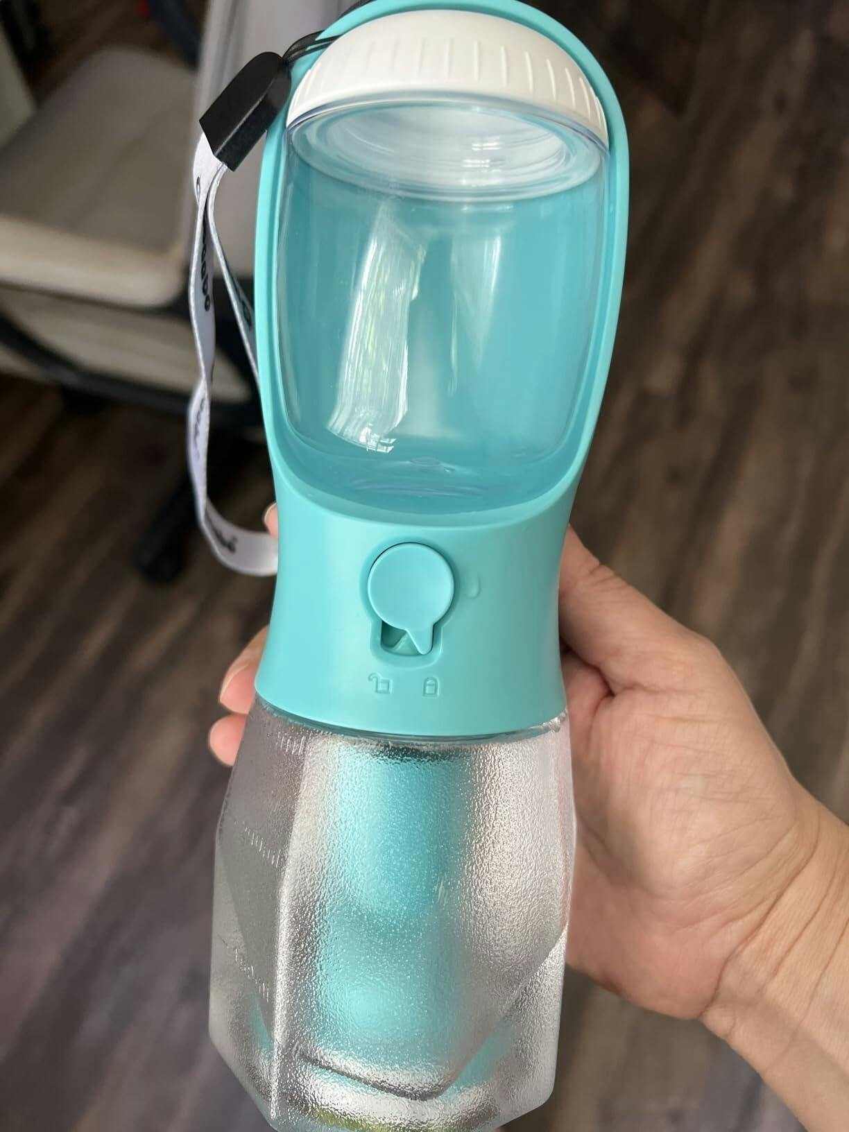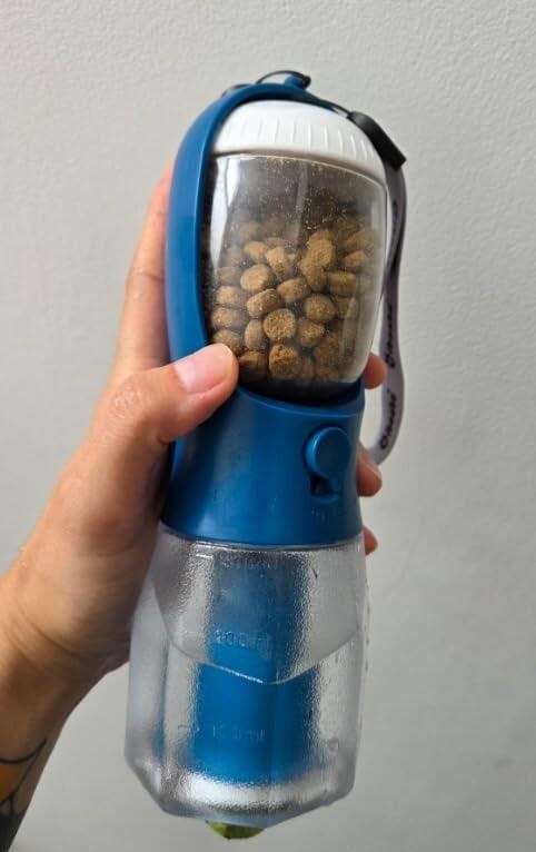 I absolutely love this travel water bottle! We used it on a recent cross-country trip, and it worked really well. The compact design with the built-in food container and poop bag dispenser made it easy to carry everything we needed in one spot—no more juggling multiple items.